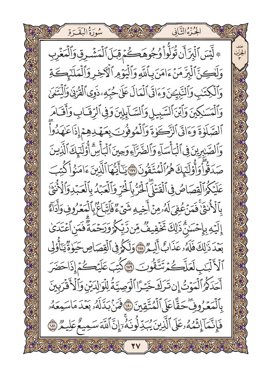 - ۞ لَّيۡسَ ٱلۡبِرَّ أَن تُوَلُّواْ وُجُوهَكُمۡ قِبَلَ ٱلۡمَشۡرِقِ وَٱلۡمَغۡرِبِ وَلَٰكِنَّ ٱلۡبِرَّ مَنۡ ءَامَنَ بِٱللَّهِ وَٱلۡيَوۡمِ ٱلۡأٓخِرِ وَٱلۡمَلَٰٓئِكَةِ وَٱلۡكِتَٰبِ وَٱلنَّبِيِّـۧنَ وَءَاتَى ٱلۡمَالَ عَلَىٰ حُبِّهِۦ ذَوِي ٱلۡقُرۡبَىٰ وَٱلۡيَتَٰمَىٰ وَٱلۡمَسَٰكِينَ وَٱبۡنَ ٱلسَّبِيلِ وَٱلسَّآئِلِينَ وَفِي ٱلرِّقَابِ وَأَقَامَ ٱلصَّلَوٰةَ وَءَاتَى ٱلزَّكَوٰةَ وَٱلۡمُوفُونَ بِعَهۡدِهِمۡ إِذَا عَٰهَدُواْۖ وَٱلصَّٰبِرِينَ فِي ٱلۡبَأۡسَآءِ وَٱلضَّرَّآءِ وَحِينَ ٱلۡبَأۡسِۗ أُوْلَٰٓئِكَ ٱلَّذِينَ صَدَقُواْۖ وَأُوْلَٰٓئِكَ هُمُ ٱلۡمُتَّقُونَ (١٧٧)
