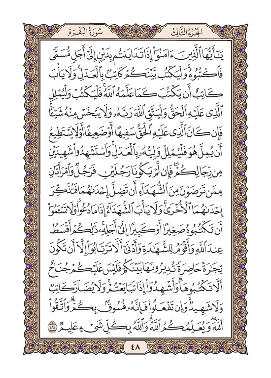- يَٰٓأَيُّهَا ٱلَّذِينَ ءَامَنُوٓاْ إِذَا تَدَايَنتُم بِدَيۡنٍ إِلَىٰٓ أَجَلٖ مُّسَمّٗى فَٱكۡتُبُوهُۚ وَلۡيَكۡتُب بَّيۡنَكُمۡ كَاتِبُۢ بِٱلۡعَدۡلِۚ وَلَا يَأۡبَ كَاتِبٌ أَن يَكۡتُبَ كَمَا عَلَّمَهُ ٱللَّهُۚ فَلۡيَكۡتُبۡ وَلۡيُمۡلِلِ ٱلَّذِي عَلَيۡهِ ٱلۡحَقُّ وَلۡيَتَّقِ ٱللَّهَ رَبَّهُۥ وَلَا يَبۡخَسۡ مِنۡهُ شَيۡـٔٗاۚ فَإِن كَانَ ٱلَّذِي عَلَيۡهِ ٱلۡحَقُّ سَفِيهًا أَوۡ ضَعِيفًا أَوۡ لَا يَسۡتَطِيعُ أَن يُمِلَّ هُوَ فَلۡيُمۡلِلۡ وَلِيُّهُۥ بِٱلۡعَدۡلِۚ وَٱسۡتَشۡهِدُواْ شَهِيدَيۡنِ مِن رِّجَالِكُمۡۖ فَإِن لَّمۡ يَكُونَا رَجُلَيۡنِ فَرَجُلٞ وَٱمۡرَأَتَانِ مِمَّن تَرۡضَوۡنَ مِنَ ٱلشُّهَدَآءِ أَن تَضِلَّ إِحۡدَىٰهُمَا فَتُذَكِّرَ إِحۡدَىٰهُمَا ٱلۡأُخۡرَىٰۚ وَلَا يَأۡبَ ٱلشُّهَدَآءُ إِذَا مَا دُعُواْۚ وَلَا تَسۡـَٔمُوٓاْ أَن تَكۡتُبُوهُ صَغِيرًا أَوۡ كَبِيرًا إِلَىٰٓ أَجَلِهِۦۚ ذَٰلِكُمۡ أَقۡسَطُ عِندَ ٱللَّهِ وَأَقۡوَمُ لِلشَّهَٰدَةِ وَأَدۡنَىٰٓ أَلَّا تَرۡتَابُوٓاْ إِلَّآ أَن تَكُونَ تِجَٰرَةً حَاضِرَةٗ تُدِيرُونَهَا بَيۡنَكُمۡ فَلَيۡسَ عَلَيۡكُمۡ جُنَاحٌ أَلَّا تَكۡتُبُوهَاۗ وَأَشۡهِدُوٓاْ إِذَا تَبَايَعۡتُمۡۚ وَلَا يُضَآرَّ كَاتِبٞ وَلَا شَهِيدٞۚ وَإِن تَفۡعَلُواْ فَإِنَّهُۥ فُسُوقُۢ بِكُمۡۗ وَٱتَّقُواْ ٱللَّهَۖ وَيُعَلِّمُكُمُ ٱللَّهُۗ وَٱللَّهُ بِكُلِّ شَيۡءٍ عَلِيمٞ (٢٨٢)